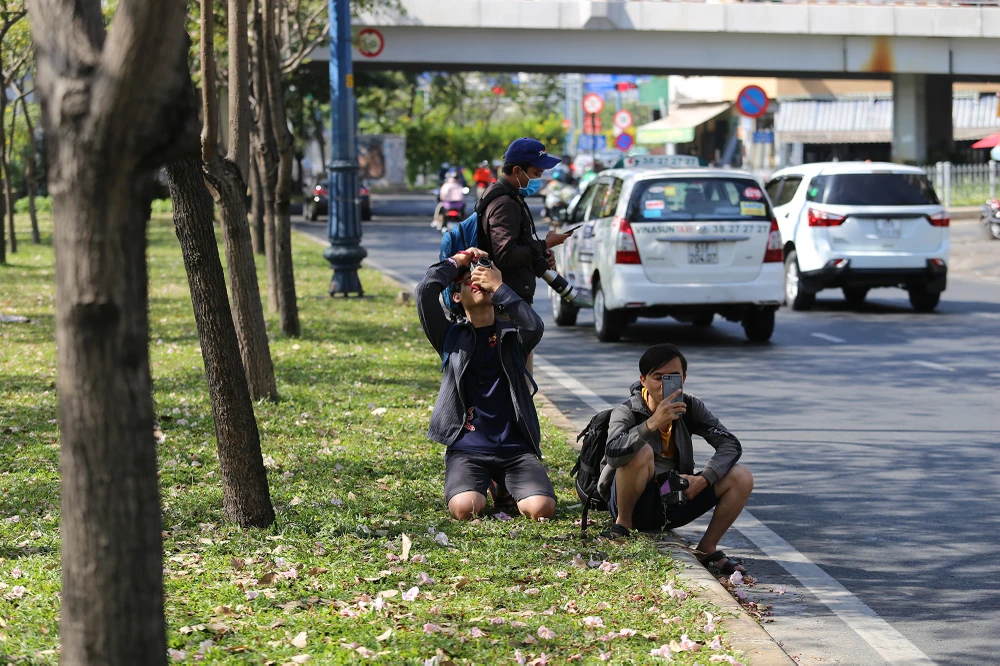 Mỗi người mỗi góc mặc dù kèn hồng chỉ mới nở được vài cây ở khu vực này.