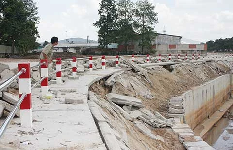 Tại hiện trường, đoạn bờ kênh dài gần 1 km phía Khu công nghiệp Đồng An bị sụt lún nghiêm trọng. Ở mặt bờ kênh bê tông xuất hiện nhiều vết nứt sâu kéo dài và những đoạn gạch bê tông ở bờ kênh nứt toác. Còn phía khu dân cư phường Bình Hòa và Quân đoàn 4 cũng có gần chục điểm bị sụt lở và nhiều chỗ bị xé vỡ kết cấu. Ông Nguyễn Văn Trí, Giám đốc Công ty Quỳnh Phúc (nhà thầu thi công), cho biết trước đó ở thượng nguồn xảy ra cơn mưa lớn, trong khi khu vực còn đang thi công nên bờ taluy của tuyến kênh sạt lở. “Bên bờ kênh có độ nghiêng quá cao nên không dùng xe lu đầm nén được nên nền đất chưa chặt và khi gặp mưa lớn đất nền dẫn đến hư hỏng” - ông Trí phân trần.