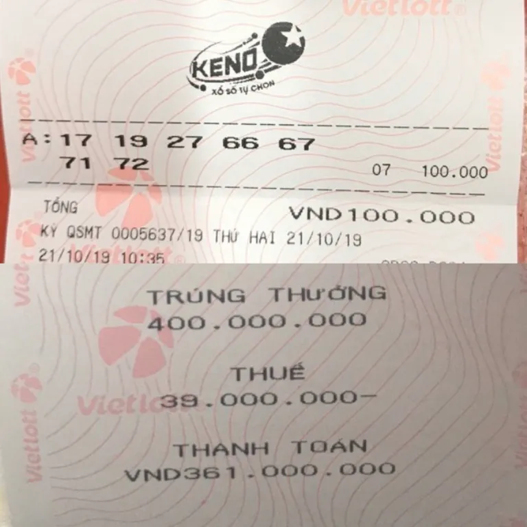 Vé trúng thưởng bậc 7 của xổ số quay nhanh Keno.