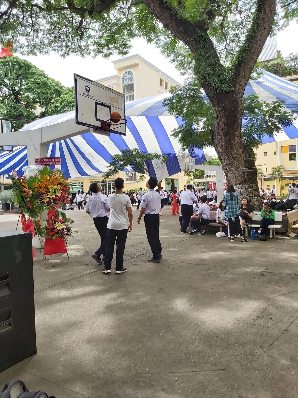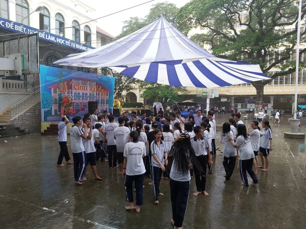 Còn các em học sinh lớp 10 Trường THPT chuyên Trần Đại Nghĩa lại được "xõa" trong hội trại được tổ chức sau lễ khai giảng năm học dù trời đổ mưa.