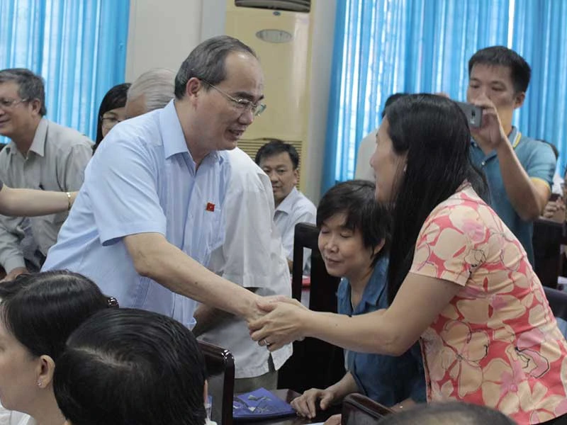 Bí thư Thành ủy TP.HCM Nguyễn Thiện Nhân trao đổi với các cử tri tại buổi tiếp xúc. Ảnh: Quốc Vũ