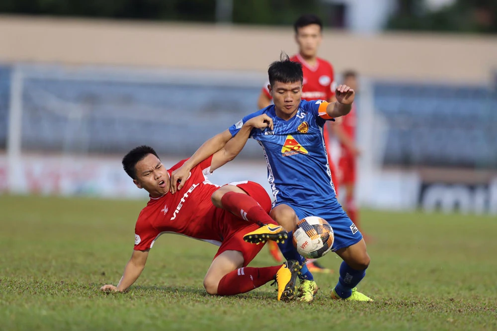 Đội trưởng Đinh Thanh Trung của Quảng Nam trong pha tranh bóng với Khắc Ngọc của Viettel. Ảnh: VPF
