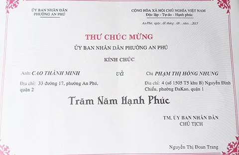 Theo hẹn, sáng 21-10, chị Diệp cùng “đức lang quân” Bùi Minh Huy hoan hỉ đến phường nhận giấy đăng ký chứng nhận kết hôn. Không chỉ được đón tiếp ân cần, cả hai anh chị cảm thấy bất ngờ, vui sướng khi nhận được lời chúc “Trăm năm hạnh phúc” được in đậm và rõ to trên thư chúc mừng của UBND phường Bình An. Thư chúc mừng được Phó Chủ tịch UBND phường Trần Thị Hồng đích thân trao tận tay hai anh chị cùng với giấy chứng nhận đăng ký kết hôn. “Tôi cảm thấy thật vui khi được chính quyền quan tâm đến sự kiện trọng đại của đời mình” - chị Diệp cười chia sẻ.
