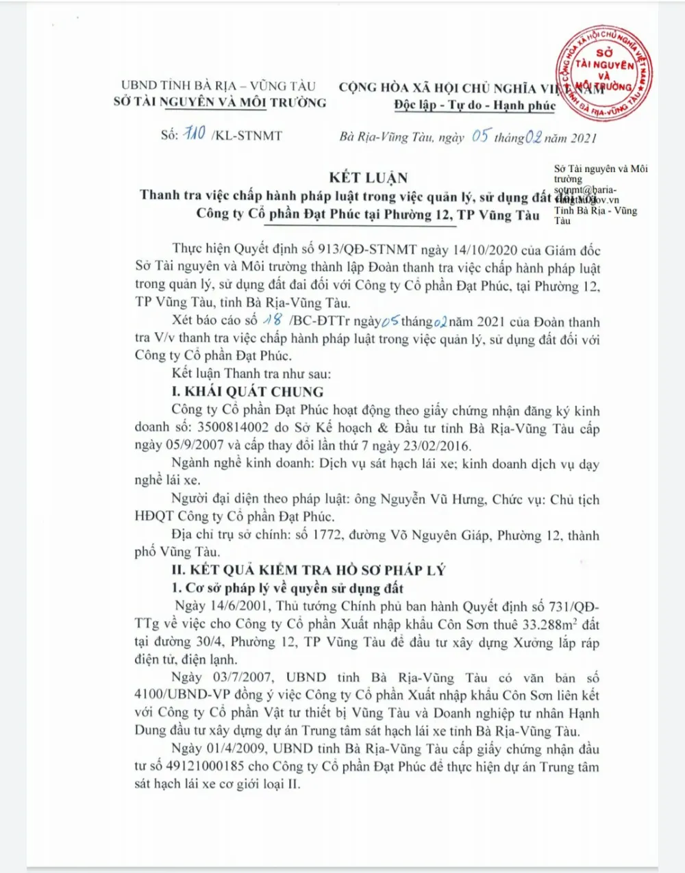 Ngày 17-2, UBND tỉnh Bà Rịa - Vũng Tàu thông tin kết luận thanh tra số 710 của Sở TN&MT tỉnh về việc chấp hành pháp luật trong việc quản lý, sử dụng đất đai đai của công ty Cổ phần Đạt Phúc (trung tâm đào tạo và sát hạch lái xe tỉnh Bà Rịa-Vũng Tàu, diện tích hơn 3,3 ha tại số 1772 đường Võ Nguyên Giáp, phường 12, TP Vũng Tàu).