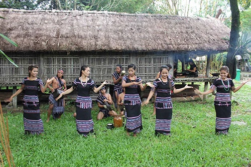 Dưới bóng mát của cây xanh, bên ngôi nhà sàn mà nơi đầu tra (đầu nhà sàn) có những cô gái đang ngồi dệt thổ cẩm. Phía trong nhà sàn, các cô gái đang thi nhau chế biến các món ẩm thực, du khách có cảm giác mình đang “sống giữa mọi người” trong cộng đồng H’Rê.