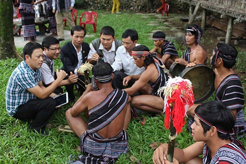 Du khách giao lưu với đội cồng chiêng xã Ba Giang tại Bảo tàng Khởi nghĩa Ba Tơ