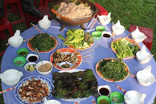 Sau khi các món ẩm thực được chế biến bày ra bàn, bày trên đầu tra, du khách sẽ được nếm món cá niêng nướng chấm muối ớt béo ngậy; món thịt trâu nướng chấm muối vừa thơm vừa đậm đà, cay cay. Món rau dớn xào tỏi mềm chan chát. Món gà H’Rê thịt chắc, thơm lừng. Sau đó, du khách vít cần hút một hơi dài rượu cần Ba Tơ được ủ men bằng lá cây rừng.