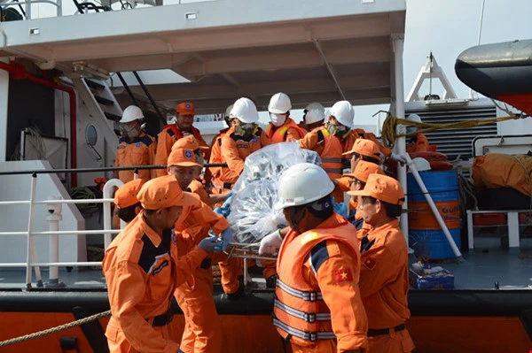 Lực lượng cứu hộ đưa nạn nhân trên tàu vào bờ. Ảnh: K.LY
