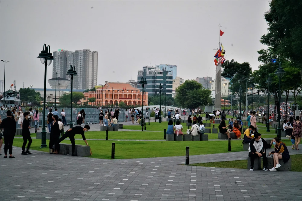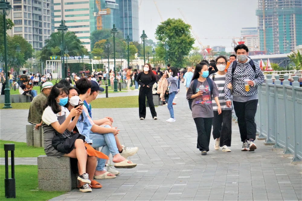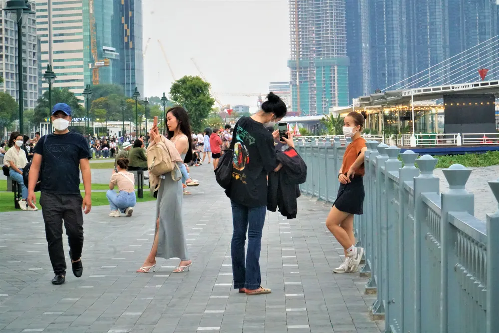 Nhiều bạn trẻ thích cuối tuần đến bến Bạch Đằng để dạo mát và chụp ảnh. Ảnh: BẢO PHƯƠNG