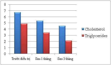 - Sau ba tháng điều trị, ở nhóm nghiên cứu đã giảm được cholesterol máu từ 6,72 xuống 4,53 và triglycerid máu từ 4,86 xuống 2,13. (Biểu đồ 3)