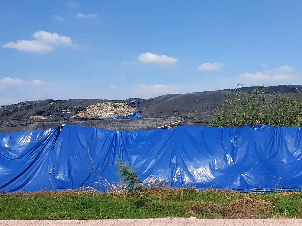 Ngoài ra, công ty Cổ phần Đầu tư Phát triển Tâm Sinh Nghĩa đang lưu giữ lượng chất thải trơ trên diện tích khoảng 63.750 m2 với khối lượng khoảng 240.000 tấn, được che phủ bằng bạt HDPE. Tuy nhiên, có nhiều khu vực không được che phủ kín để lộ chất thải ra ngoài trời, nước rỉ rác từ bãi được thu gom qua rãnh bao xung quanh khu vực bằng bạt HDPE, một số vị trí không được phủ kín nên nước rỉ rác không được thu gom triệt để và chảy trực tiếp vào môi trường đất và chảy ra hồ trong khuôn viên công ty, hồ này không lót đáy và không có trong hồ sơ công trình bảo vệ môi trường của công ty đã được phê duyệt.