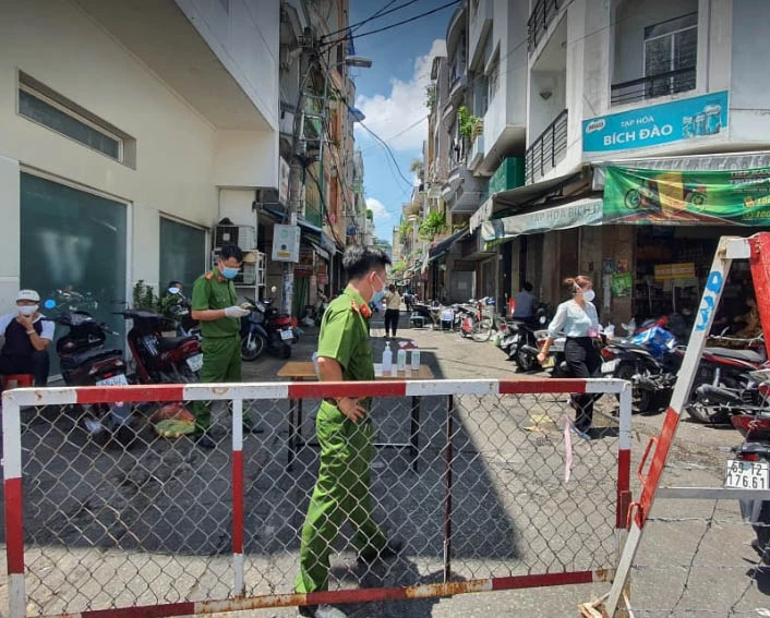 Cơ quan chức năng phong tỏa khu vực bệnh nhân COVID-19 sinh sống. Ảnh: PHẠM YẾN