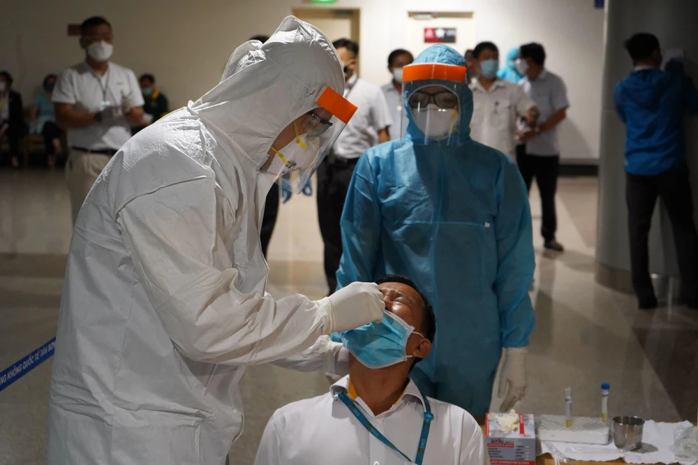 Nhân viên ở sân bay Tân Sơn Nhất đang được lấy mẫu xét nghiệm COVID-19. Ảnh: HL