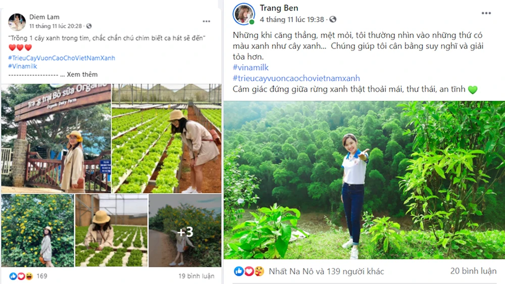 Bạn T. Hằng chia sẻ cảm nhận khi tham gia chiến dịch Triệu cây vươn cao cho Việt Nam xanh: “Tôi biết đến chiến dịch này vì được người bạn của mình tag vào. Ban đầu tôi tham gia vì thấy chương trình rất ý nghĩa. Thế nhưng, sau khi đăng những bức ảnh với cây cối, thiên nhiên, kể những câu chuyện về sống xanh, tôi thấy mình như được truyền cảm hứng tích cực hơn mỗi ngày. Thế là lại chăm chỉ đăng bài tham gia, vừa góp được cây xanh, vừa thấy tinh thần thêm vui vẻ, tươi mới”.