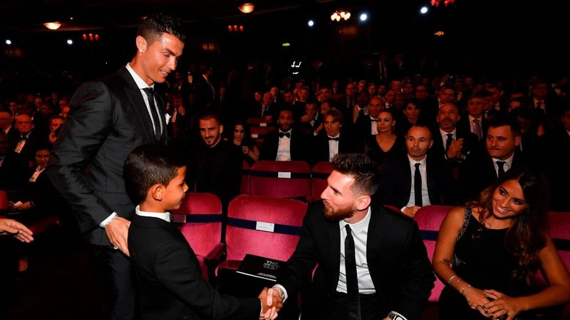 Ronaldo dẫn con trai đến gặp Messi trong buổi lễ trao quả bóng vàng. ẢNH: MIRROR