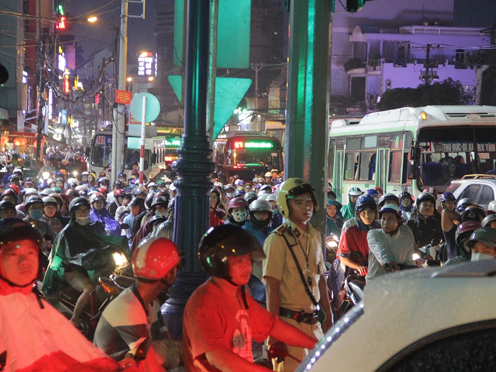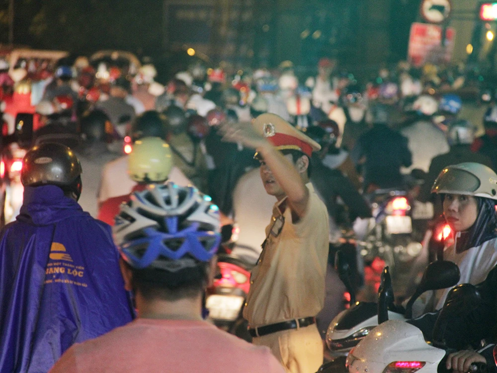 Lực lượng CSGT có mặt phân luồng nhưng do lượng phương tiện quá lớn nên tình trạng kẹt xe giảm chậm.