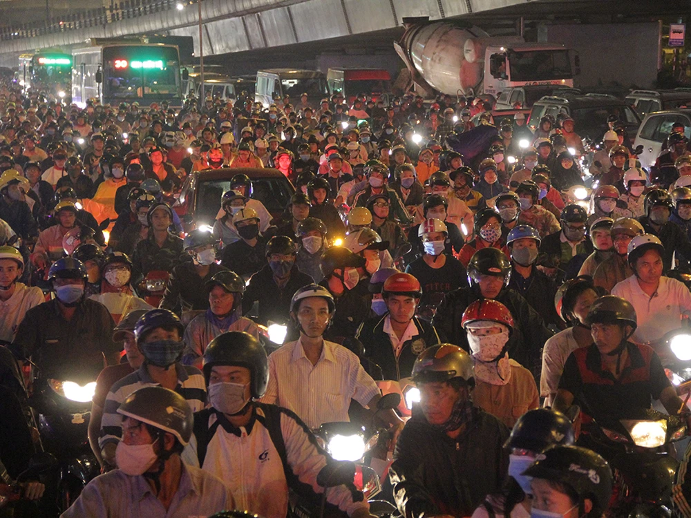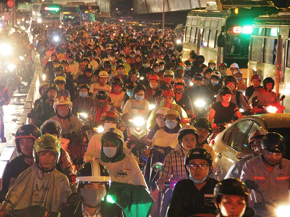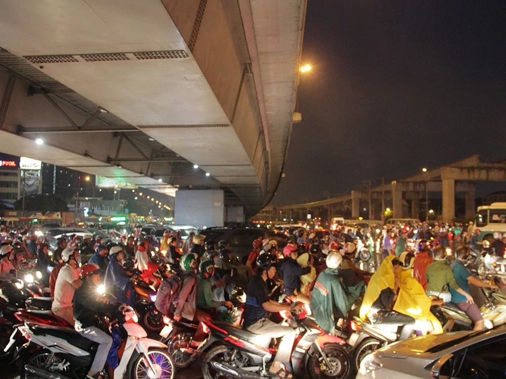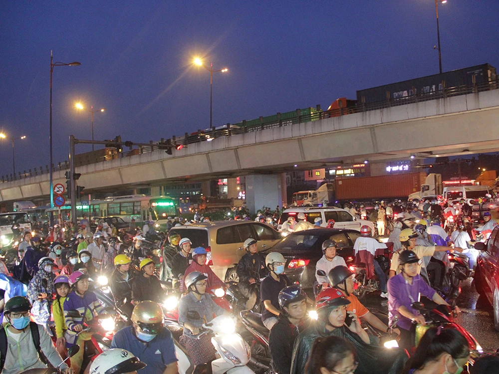 Trong cơn mưa chiều ngày 21-9, đúng vào giờ tan tầm hàng ngàn phương tiện đổ dồn về ngã tư Thủ Đức (quận Thủ Đức, TP.HCM) khiến giao thông hỗn loạn.