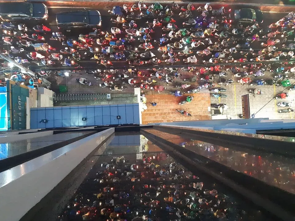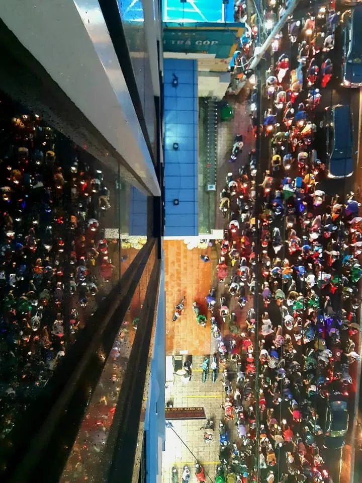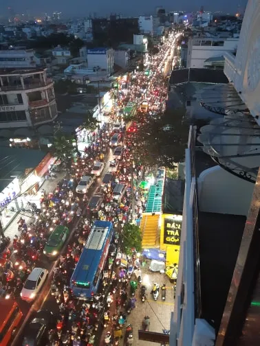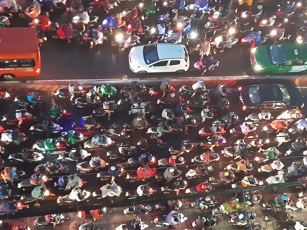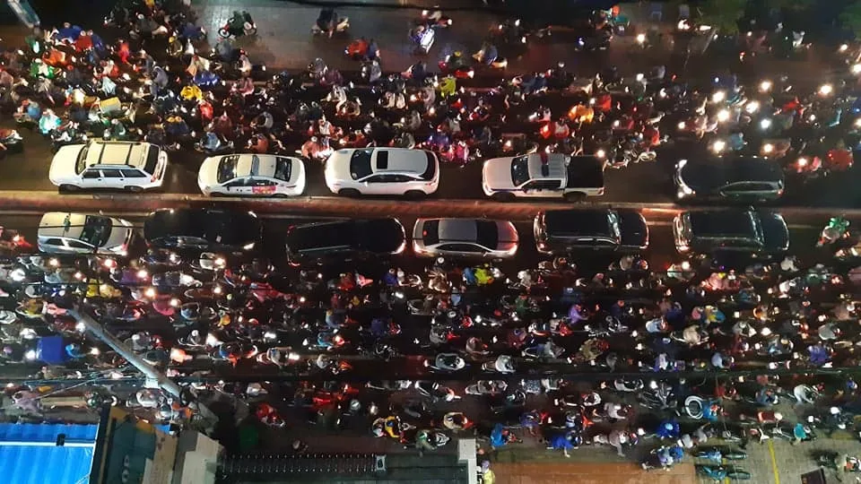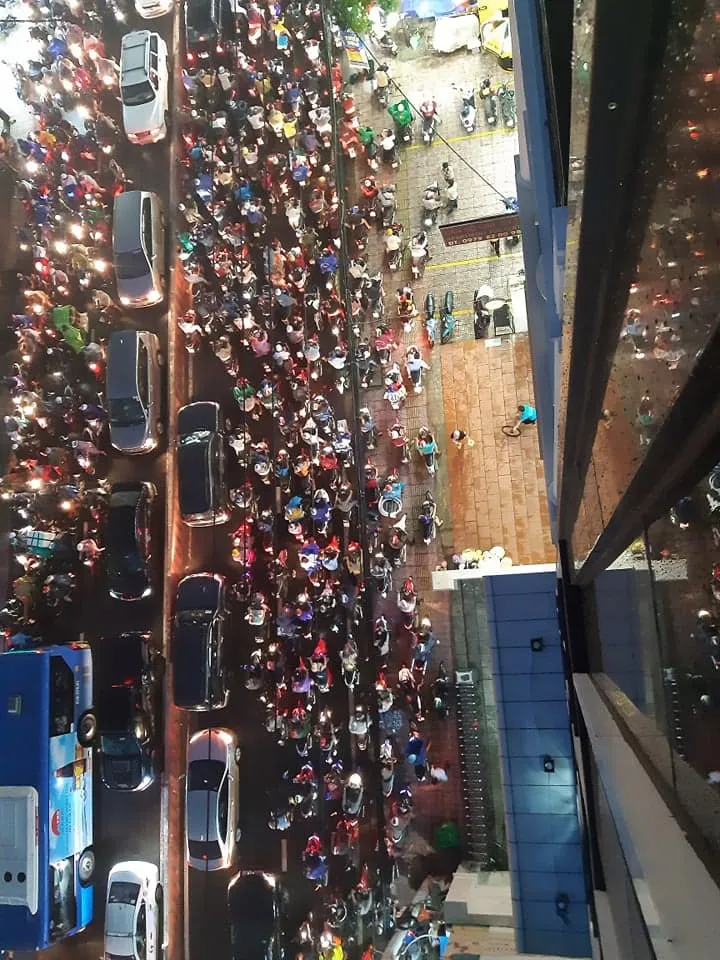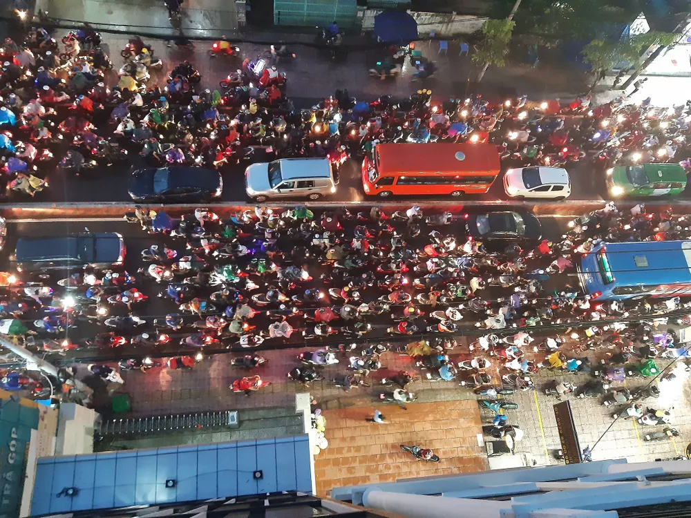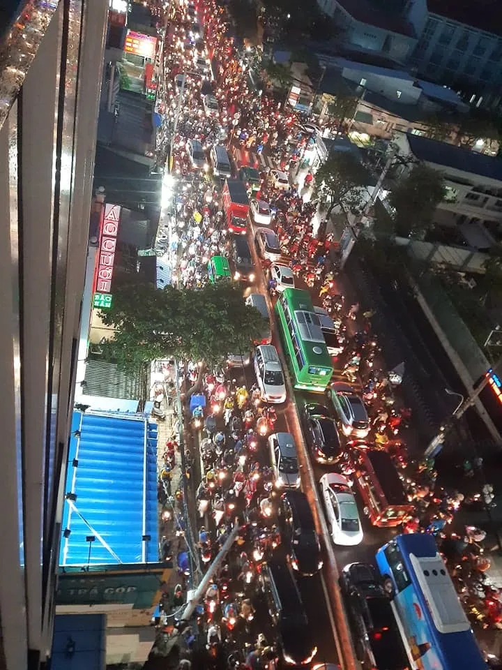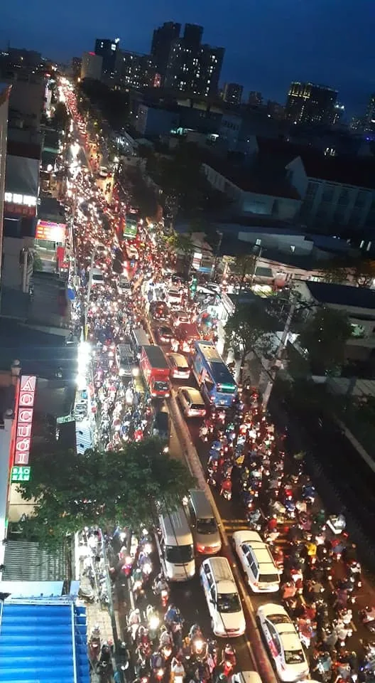 Đến giờ cao điểm chiều, vẫn còn mưa nhẹ, hàng ngàn người hết giờ tan tầm đang lưu thông đã bị kẹt cứng. Theo quan sát, điểm kẹt xe kéo dài hơn 2 km, các phương tiện di chuyển nhích từng chút một trong cơn mưa.