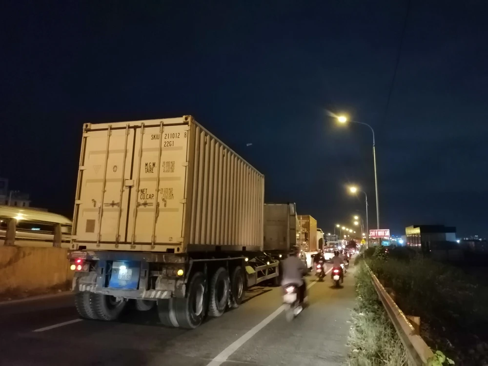 Xe máy, xe container lưu thông hỗn độn. Ảnh: THU TRINH