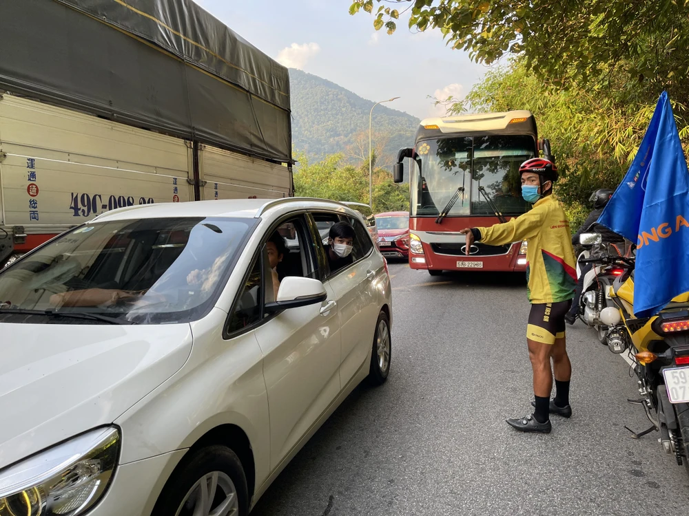 Các thành viên đoàn đua và tay đua Trần Thanh Nhanh tham gia giải toả ùn tắc trên đèo.
