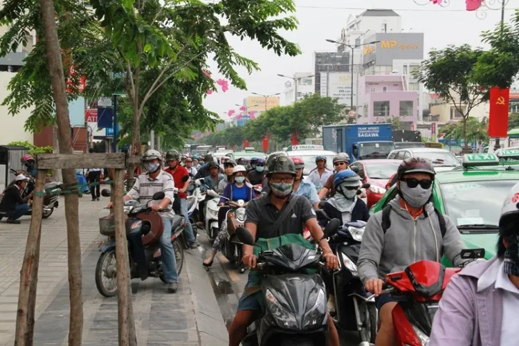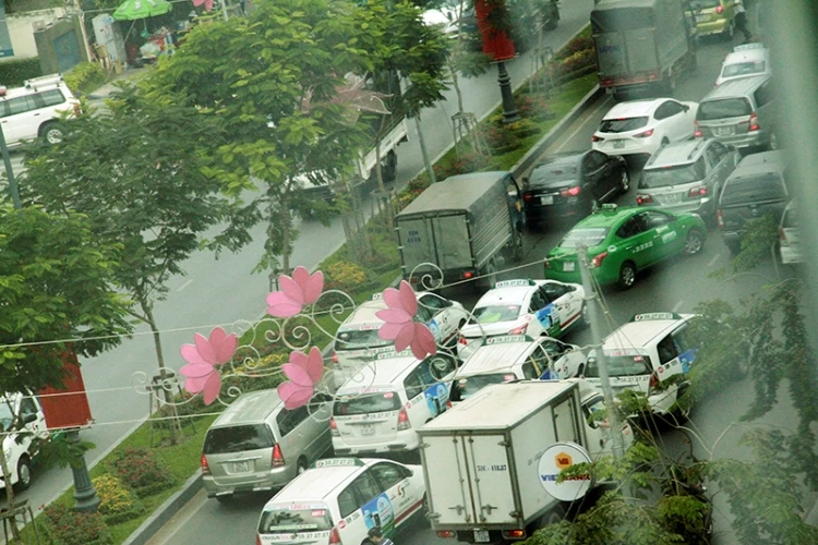 Tại điểm dừng chờ đèn đỏ ở giao lộ A1 - Trường Sơn dẫn vào sân bay, dòng xe “khó nhọc” nhích từng phân
