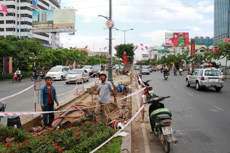Trong ngày 27-1, trên đường Trường Sơn, các đơn vị thi công cũng tiến hành cắt một đoạn dải phân cách tim đường (25x2 m) để tạo điểm quay đầu xe tại vị trí giữa đường Tiền Giang và đường Cửu Long, hệ thống đèn điện và cáp ngầm cũng được thiết đặt lại phục vụ công trình này.