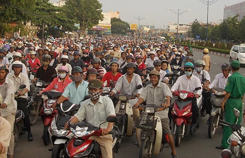 Cơ quan chức năng đang bối rối trước nạn ùn ứ xe máy ở đường Trường Chinh xảy ra như cơm bữa. Ảnh: LƯU ĐỨC