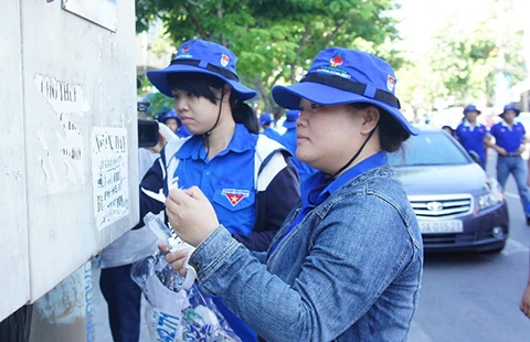 Các đoàn viên ở Đà Nẵng ra quân bóc, gỡ thông tin quảng cáo rao vặt dán tại trên trụ điện, tường rào. Ảnh: LÊ PHI