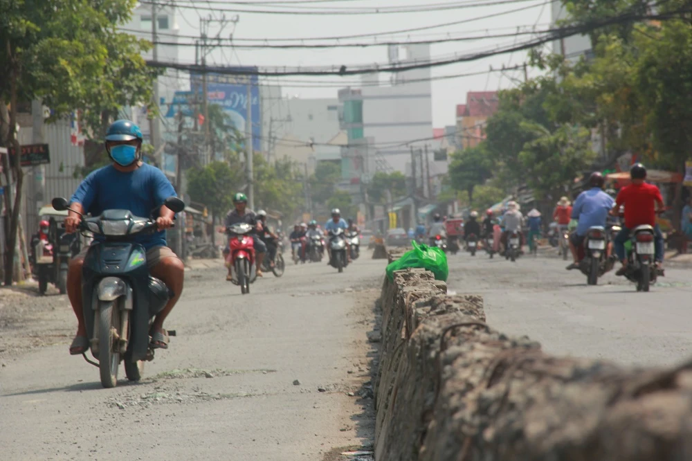 Trưa về, triều cường rút, người dân phải đối mặt với khói bụi bay mù mịt mỗi khi di chuyển qua đoạn đường này.