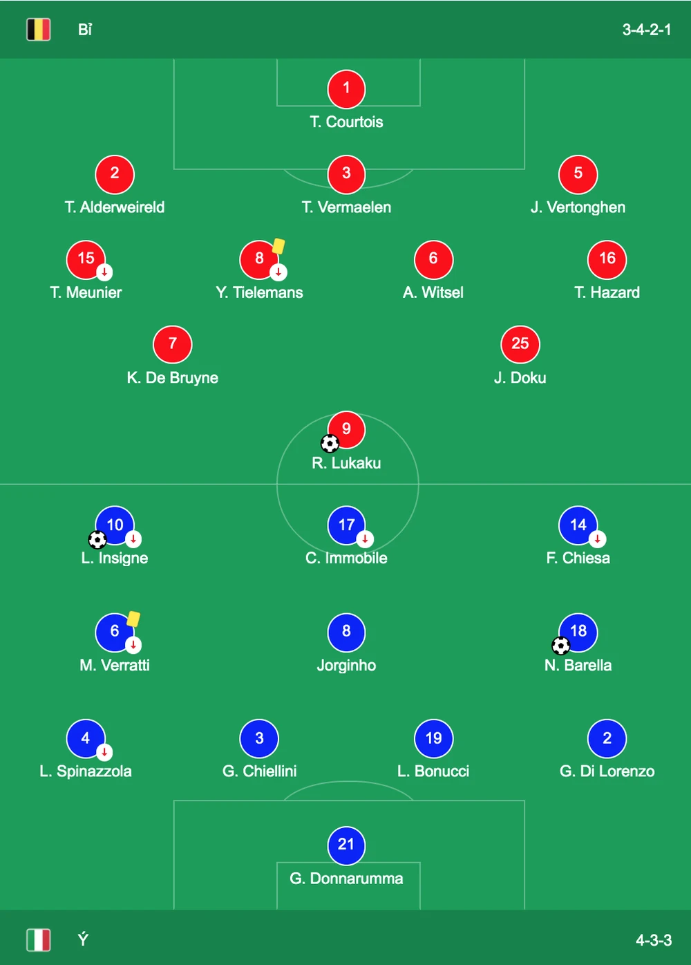 Tuyển Bỉ tìm thấy ánh sáng cuối đường hầm trước khi hiệp một kết thúc. Romelu Lukaku thực hiện thành công quả phạt đền gỡ 1-2 sau khi Nicolo Barella và Lorenzo Insigne đã lập công cho Azzurri.