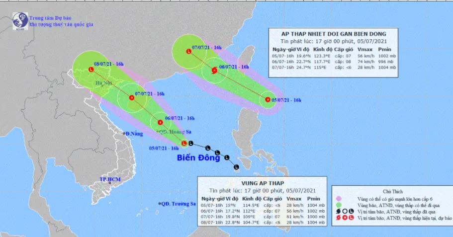 Dự kiến đến 16 giờ chiều mai, 6-7, ATNĐ ở ngay trên khu vực phía bắc quần đảo Hoàng Sa với cường độ cấp 6-7, giật cấp 9.