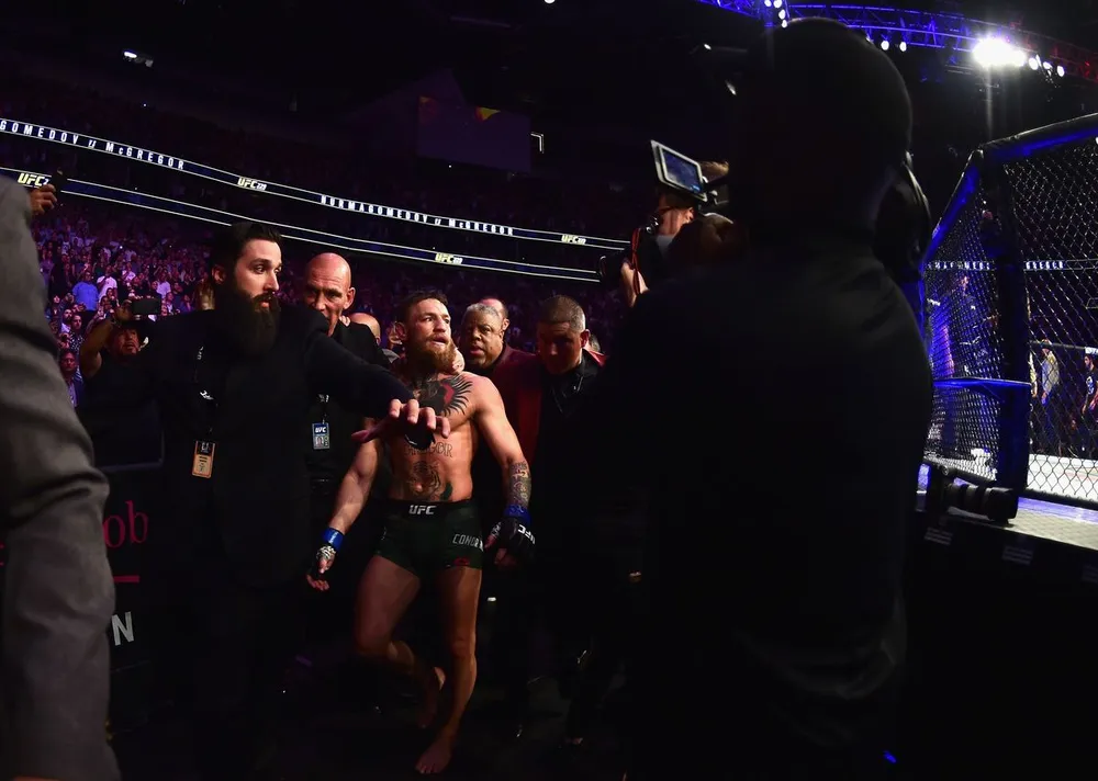 McGregor hậm hực rời sàn đấu khi thua cuộc.