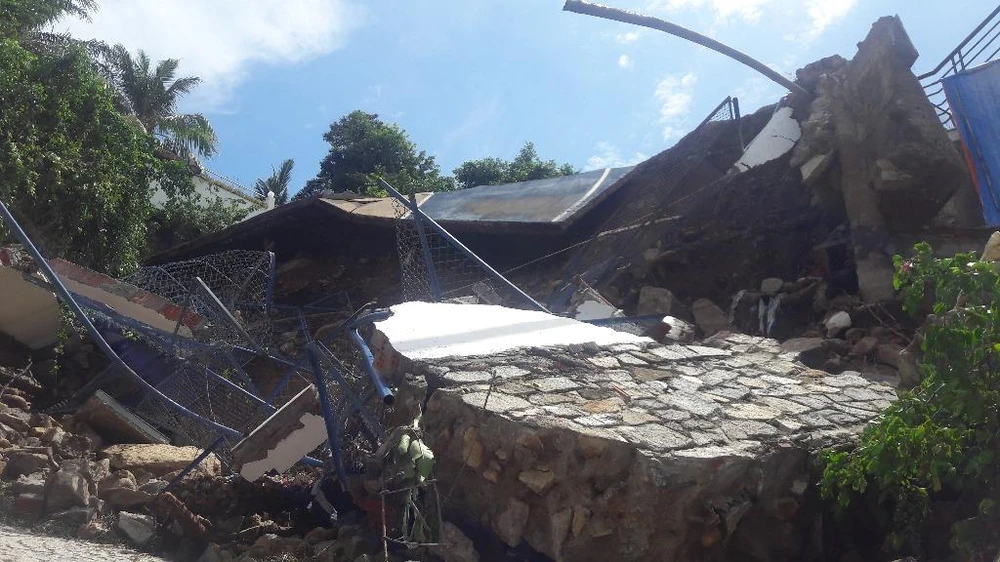 Sáng 6-10, đoàn kiểm tra của TP Vũng Tàu ghi nhận nguyên nhân dẫn đến sự cố trên là do mưa quá lớn khiến phần sân thể thao của gia đình ông Lê Hùng Ân – nằm treo trên khách sạn Kỳ Hòa ngập nước, không thoát kịp đã sập xuống một nửa, đè luôn bức tường ngăn với phần đất của khách sạn.