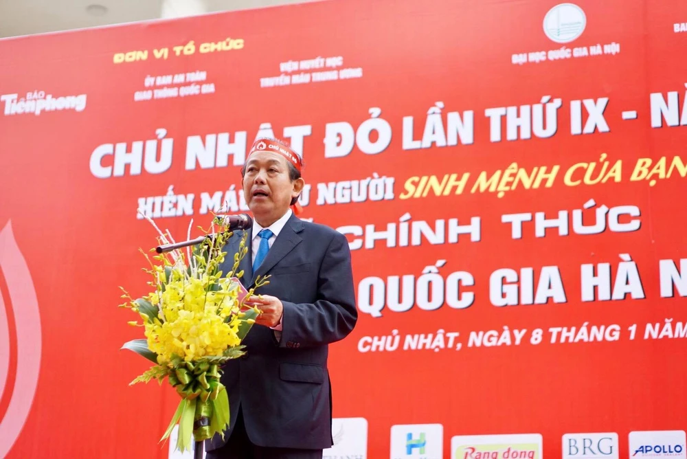 Tại ngày hội Chủ nhật đỏ ở ĐH Quốc gia Hà Nội, Phó Thủ tướng Trương Hòa Bình cùng lãnh đạo Bộ Y tế, Ủy ban An toàn giao thông quốc gia cùng hàng ngàn sinh viên, thanh niên thủ đô tham gia diễu hành, cổ động hoạt động hiến máu nhân đạo.