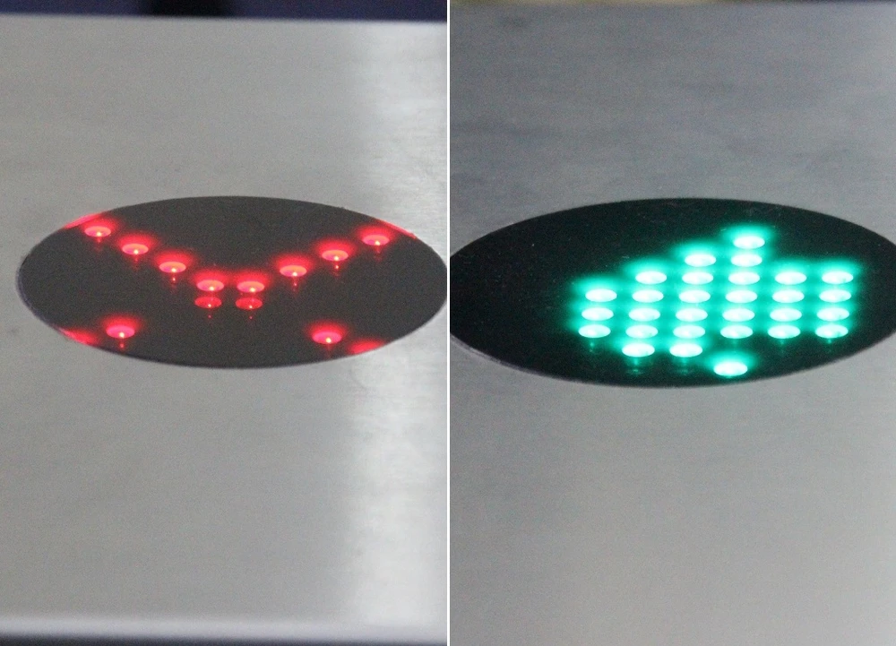 Khi tín hiệu chuyển từ màu đỏ sang xanh, nghĩa là vé hợp lệ, cửa chắn tại cổng soát vé sẽ mở ra để hành khách lên tàu.