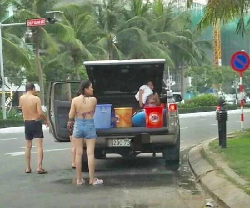 Tuy nhiên sau đó, nhóm người này vô tư tắm táp nước ngọt bằng chính nước mà họ mang theo bằng nhiều xô nhựa sau thùng xe. Nhiều người cùng tắm khiến nước chảy tràn xuống lòng đường, tạo ra cảnh nhếch nhác và hình tượng rất phản cảm.