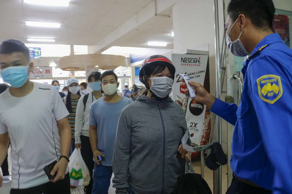 Lực lượng chức năng triển trai nhiều biện pháp phòng chống dịch Covid-19. Dù kỳ nghỉ lễ diễn ra trong thời điểm dịch bệnh vẫn còn phức tạp, nhưng nhiều người dân tỏ ra khá an tâm khi bến xe áp dụng nhiều biện pháp phòng chống dịch như đo thân nhiệt trước khi vào bãi đổ xe, rửa tay, xác khuẩn và đeo khẩu trang đúng quy định.