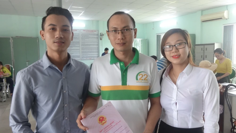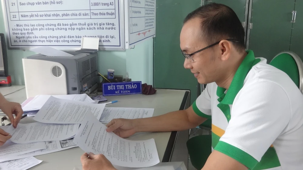 Anh Phú (ở giữa) tại Phòng Công chứng huyện Long Điền, tỉnh Bà Rịa-Vũng Tàu.