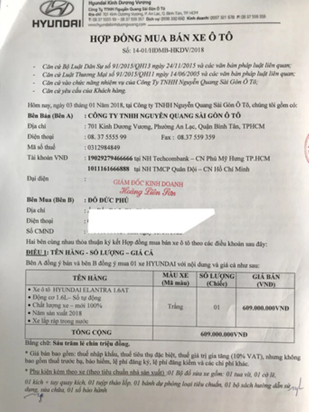 Hợp đồng mua bán xe Hyundai Elantra đời 2018 giữa ông Phú và đại lý Hyundai Kinh Dương Vương.