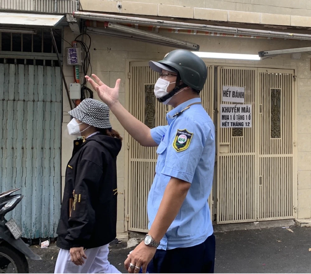 Đội quản lý trật tự đô thị làm nhiệm vụ giải tán đám đông khi khách hàng liên tục ghé tiệm bà Huynh mua bánh dù quán dán thông báo hết bánh. Ảnh: THẢO PHƯƠNG