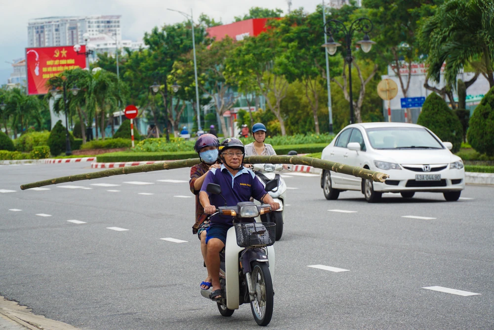 Ông Hoàng nhà ở quận Sơn Trà cùng vợ chạy xe máy đi mua tre về chằng chống nhà cửa.