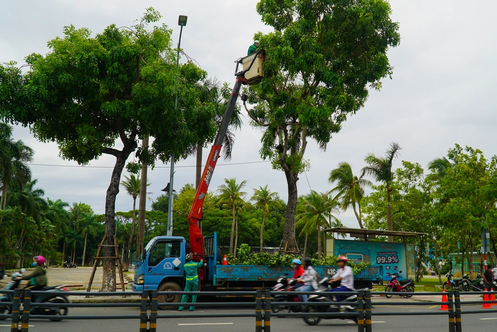 Nhóm xe của các đơn vị cây xanh khẩn trương cắt tỉa cây ở nhiều tuyến đường trong TP tránh bão quật ngã.