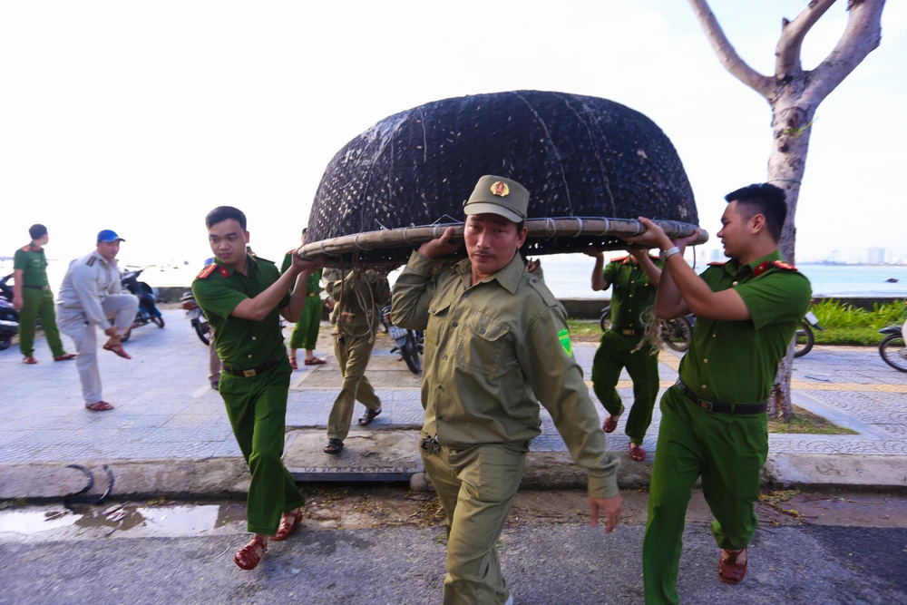 Công an hỗ trợ ngư dân phường Thọ Quang (quận Sơn Trà) di chuyển tàu, thuyền.