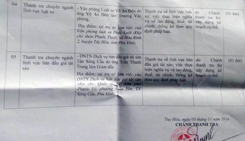 Luật sư Đôn cũng cho biết thêm đúng chiều 8-1, ông đã nhận được quyết định phê duyệt kế hoạch công tác thanh tra năm 2015 do giám đốc Sở Tư pháp tỉnh Phú Yên Nguyễn Công Danh ký ngày 3-11-2014. Theo đó, văn phòng luật sư của ông là văn phòng luật sư duy nhất ở tỉnh Phú Yên nằm trong kế hoạch thanh tra chuyên ngành lĩnh vực luật sư năm 2015. Nội dung thanh tra gồm việc thực hiện nghĩa vụ về lao động, thuế, tài chính, thống kê...