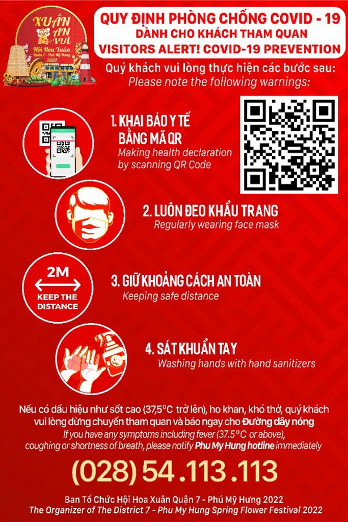 Khách tham quan Hội hoa xuân Phú Mỹ Hưng được yêu cầu phải tuân thủ nghiêm túc thông điệp 5K của Bộ Y tế: Khai báo y tế bằng mã QR code tại cổng ra/vào – Luôn mang khẩu trang trong suốt chuyến tham quan – Khử khuẩn tay – Giữ khoảng cách an toàn – Đo thân nhiệt. Đối với những khách tham quan có dấu hiệu sốt trên 37,5 độ, ho khan, khó thở… Ban tổ chức sẽ yêu cầu tạm dừng chuyến tham quan.