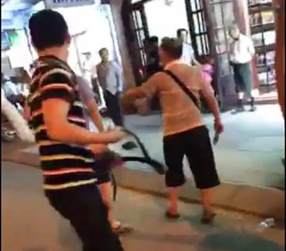 Hai bên ẩu đả gây náo loạn cả một đoạn đường Trần Phú... Trong lúc hỗn loạn, một người đàn ông Trung Quốc cầm dao hăm dọa, la ó.