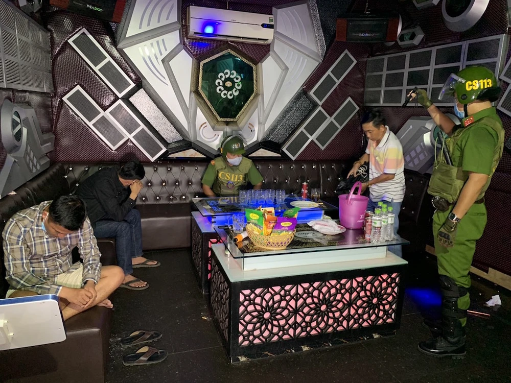 Khuya 12-9, Tổ công tác thuộc lực lượng Cảnh sát quản lý hành chính và trật tự xã hội phối hợp với Công an TP Long Xuyên kiểm tra hành chính quán Karaoke Katina II ở phường Mỹ Xuyên, TP Long Xuyên.