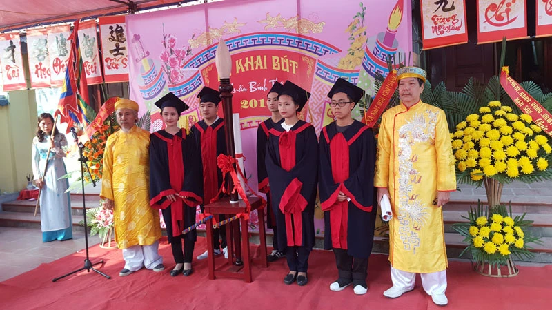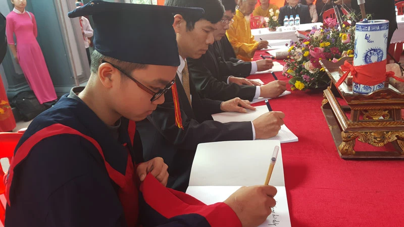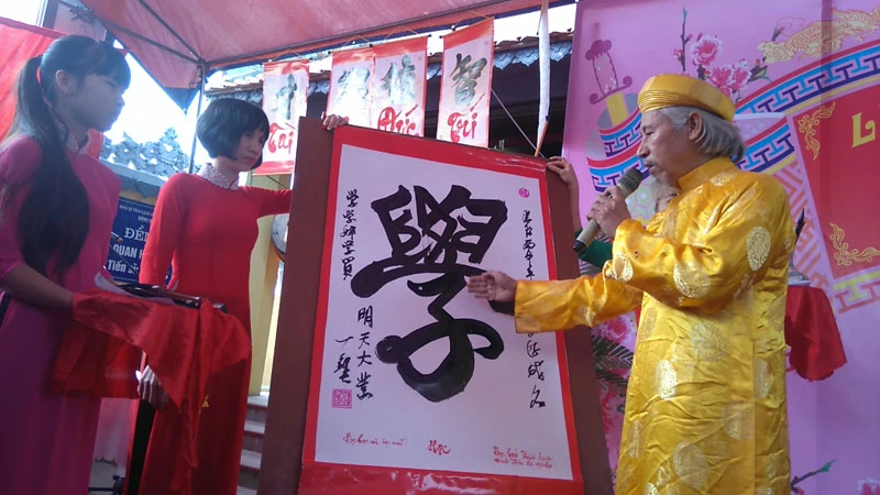 Sau khi thực hiện các nghi thức tế lễ và rước bút, nghiên, mực vòng quanh cụm di tích, nhà thư pháp Lê Thiên Lý, Giám đốc Trung tâm Thư pháp, câu đối và Hán-Nôm học TP.Hải Phòng đã viết chữ “Học”.