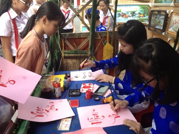 "Bà đồ" thi triển thư pháp theo yêu cầu của nhiều em học sinh.