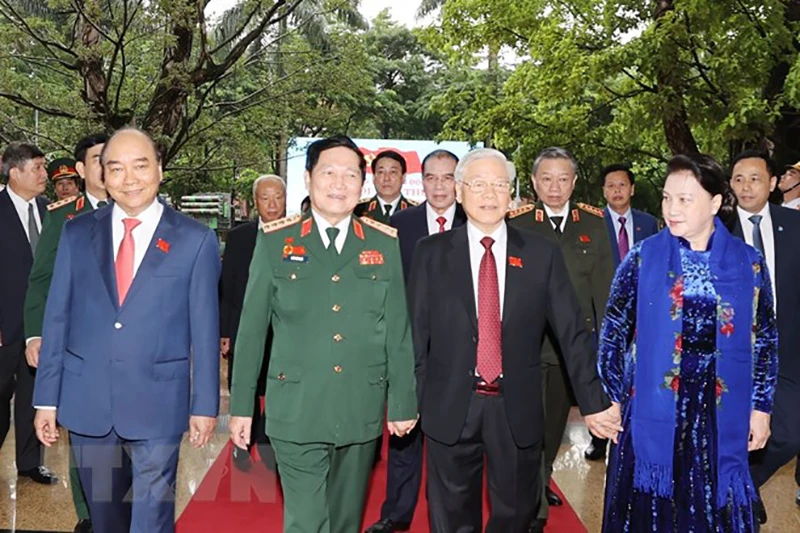 Tổng bí thư, Chủ tịch nước Nguyễn Phú Trọng cùng các lãnh đạo và nguyên lãnh đạo Đảng, Nhà nước tới dự Đại hội Đảng bộ Quân đội. Ảnh: TTXVN